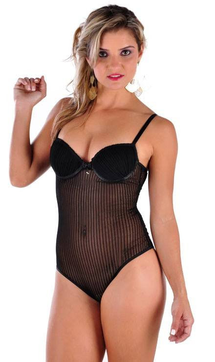 -Body com transparência com bojo, sem fecho entre as pernas.