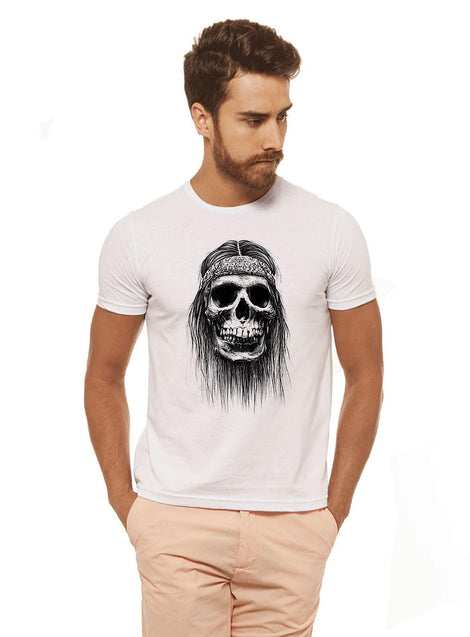 -Camiseta Branca Estampada Masculina Joss - Caveira Bandana , caimento reto e solto.