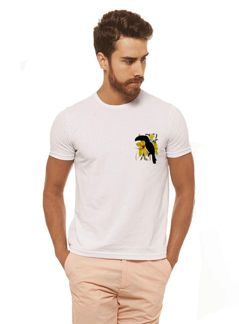-Camiseta Branca Estampada Masculina Joss - F Tucano Flor , caimento reto e solto.