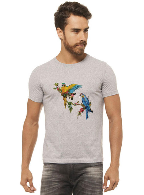 -Camiseta Cinza Mescla Estampada Masculina Joss - Arara Colorida, caimento reto e solto.