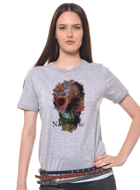 Camiseta Joss Cinza Mescla Estampada Caveira Rosas
