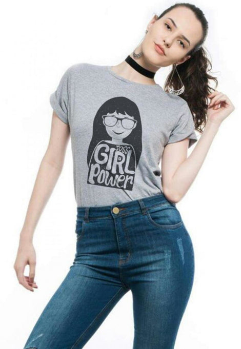-T-Shirt Joss Mescla Girl Power Glasses Cinza,Caimento Reto e Gola Careca.