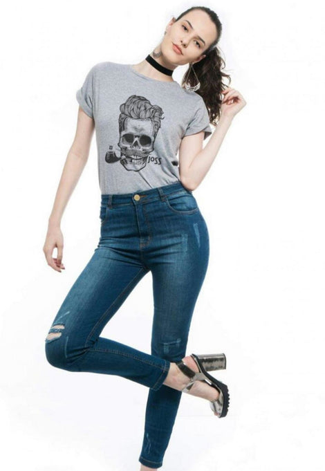 -T-Shirt Joss Mescla Caveira Charuto Cinza,,Caimento Reto e Gola Careca.