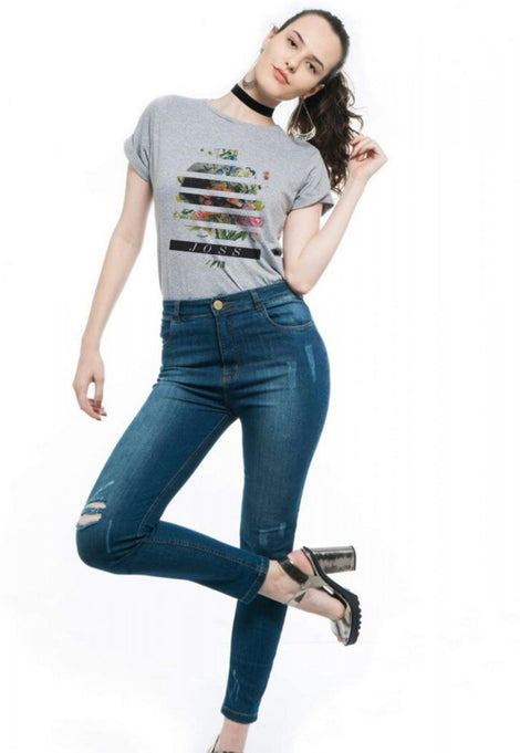 -T-Shirt Joss Mescla Skull Cinza,Caimento Reto e Gola Careca.