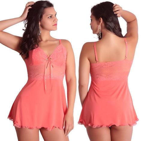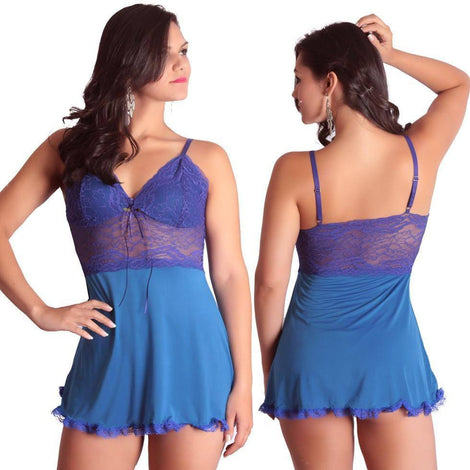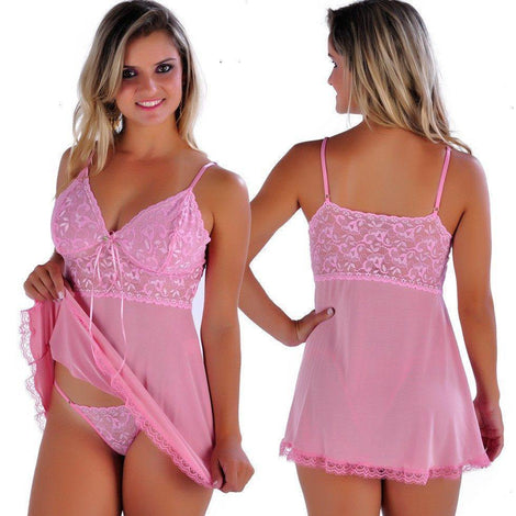 Descrição do produto: Camisola de renda e liganete com alça fixa e regulável. Calcinha de renda na frente e atrás de liganete e forro 100% algodão.