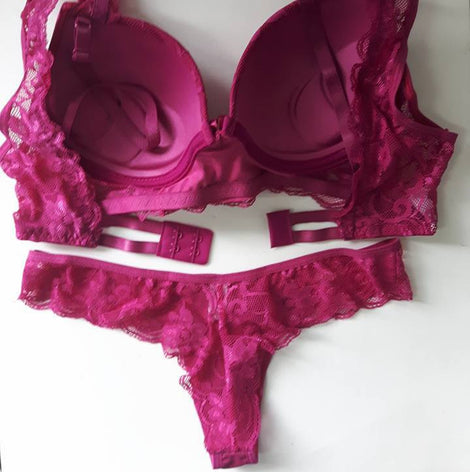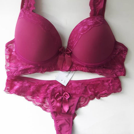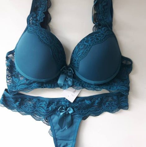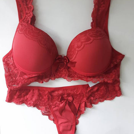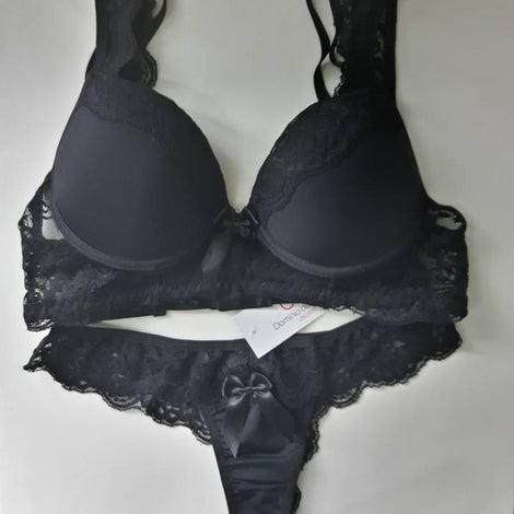 >Detalhes em lacinho no centro do sutiã e da calcinha