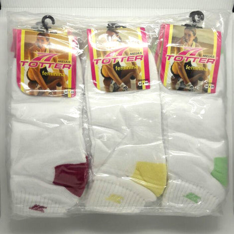 Par de meias em algodão conforto, curta/soquete. São todas na cor Branca com pequenos detalhes coloridos na ponta dos pés e no calcanhar.