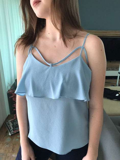 Compre Regata Decote Vies Azul Claro no atacado por preço de fábricaEspecificações
