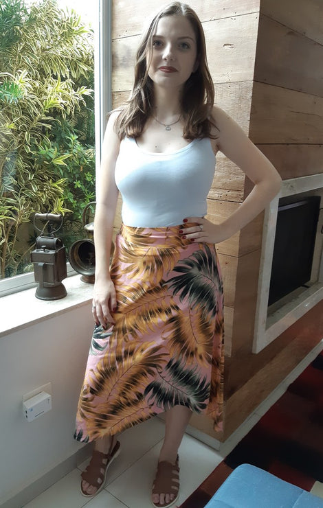 -Saia midi, recorte assimétrico com estampa de folhas, perfeita para usar no verão, trazendo conforto e design inovador.