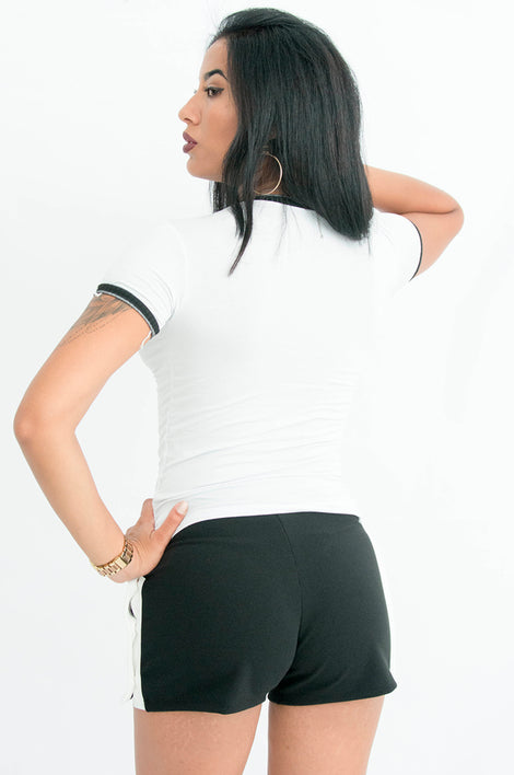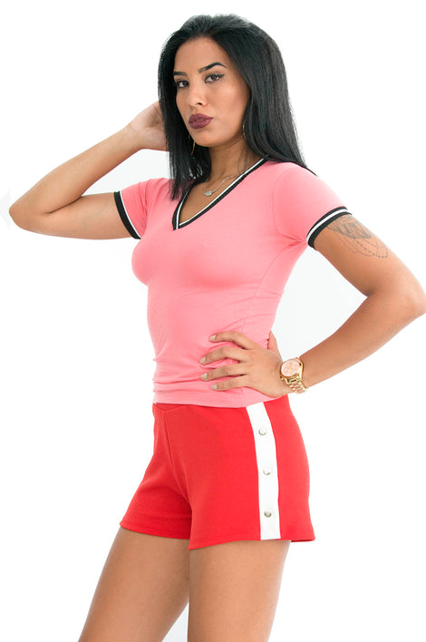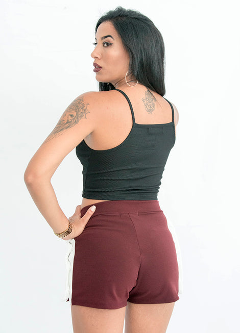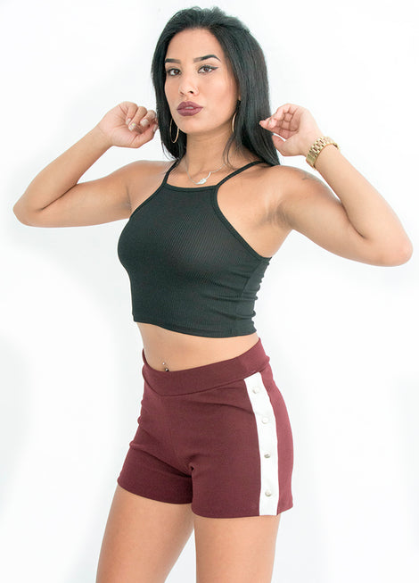 -Shortinho de malha crepe com faixa nas laterais e botões de pressão em metal, ótimo para usar no alto verão, confortável e elegante.