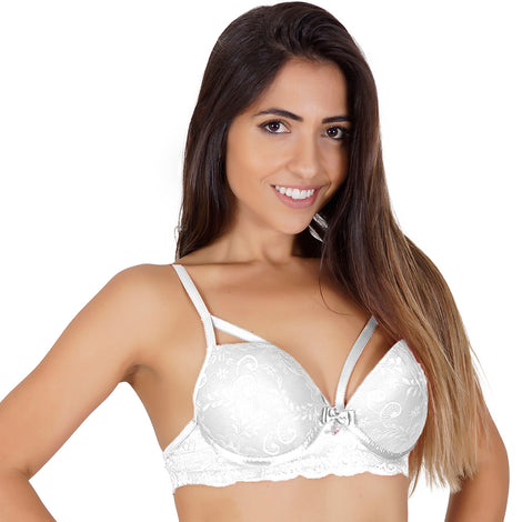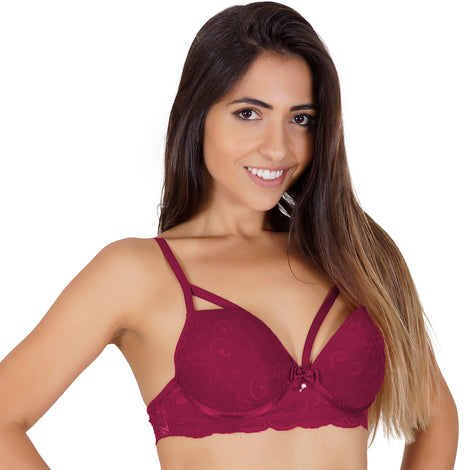 Soutien strappy confeccionado em renda, com bojo e laço de cetim.