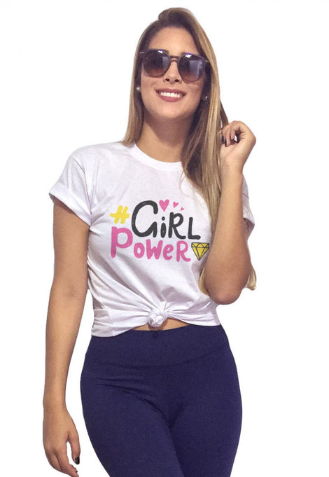 -T-Shirt Feminina Girl Power Diamond Branco com Caimento Reto e Gola Careca.