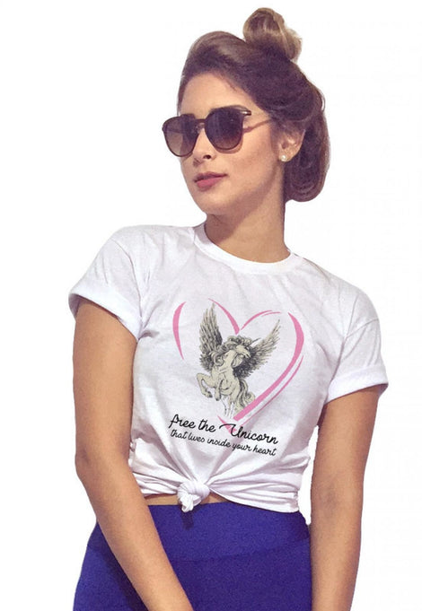 -T-Shirt Feminina Free The Unicorn com Caimento Reto e Gola Careca.