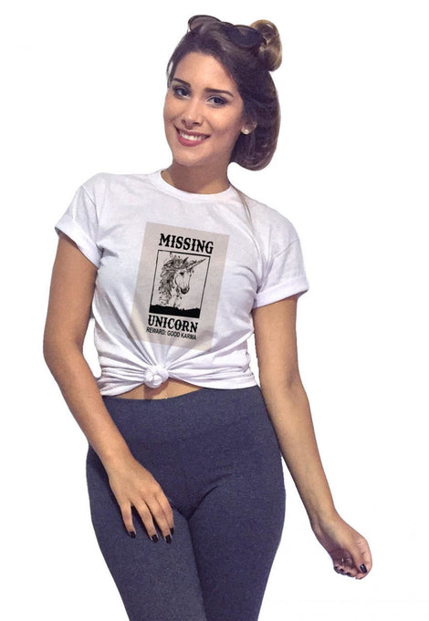 -T-Shirt Feminina Missing Unicornio com Caimento Reto e Gola Careca.