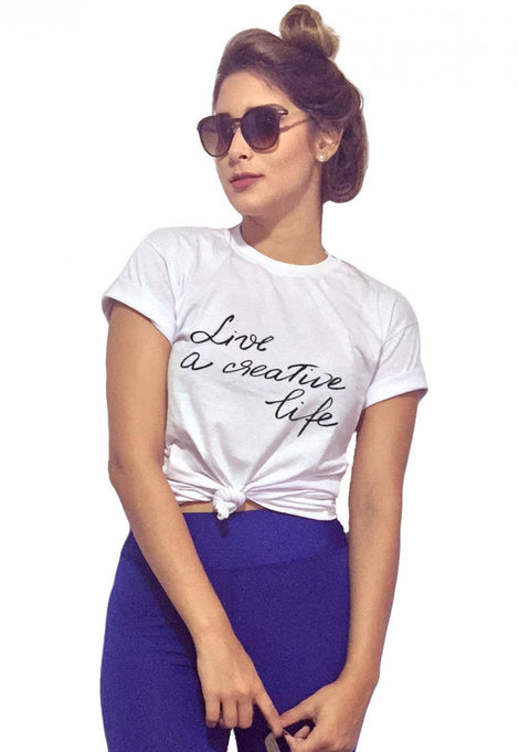 -T-Shirt Feminina Live a Creative com Caimento Reto e Gola Careca.