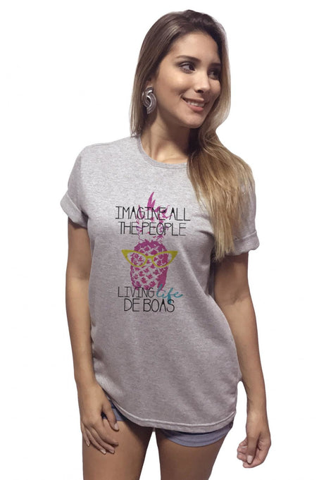 -T-Shirt Feminina Escrita Imagina All The People,com Caimento Reto e Gola Careca.