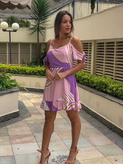 -O vestido Fabi é feito em viscose leve todo forrado, sua modelagem é godê, detalhe para as mangas amarradas e babado na barra.