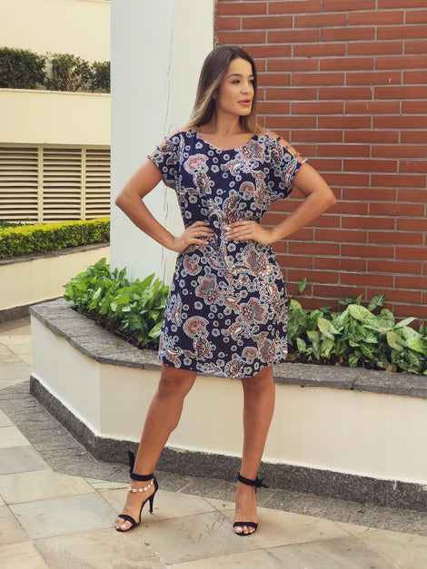 Vestido com corte clássico e estampa em arabesco, comprimento um pouco acima do joelho.