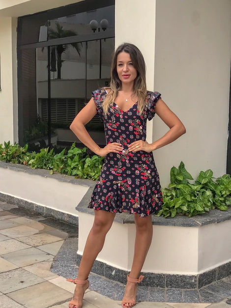 -Vestido em viscose com forro interno, com babados nas alças, comprimento médio.